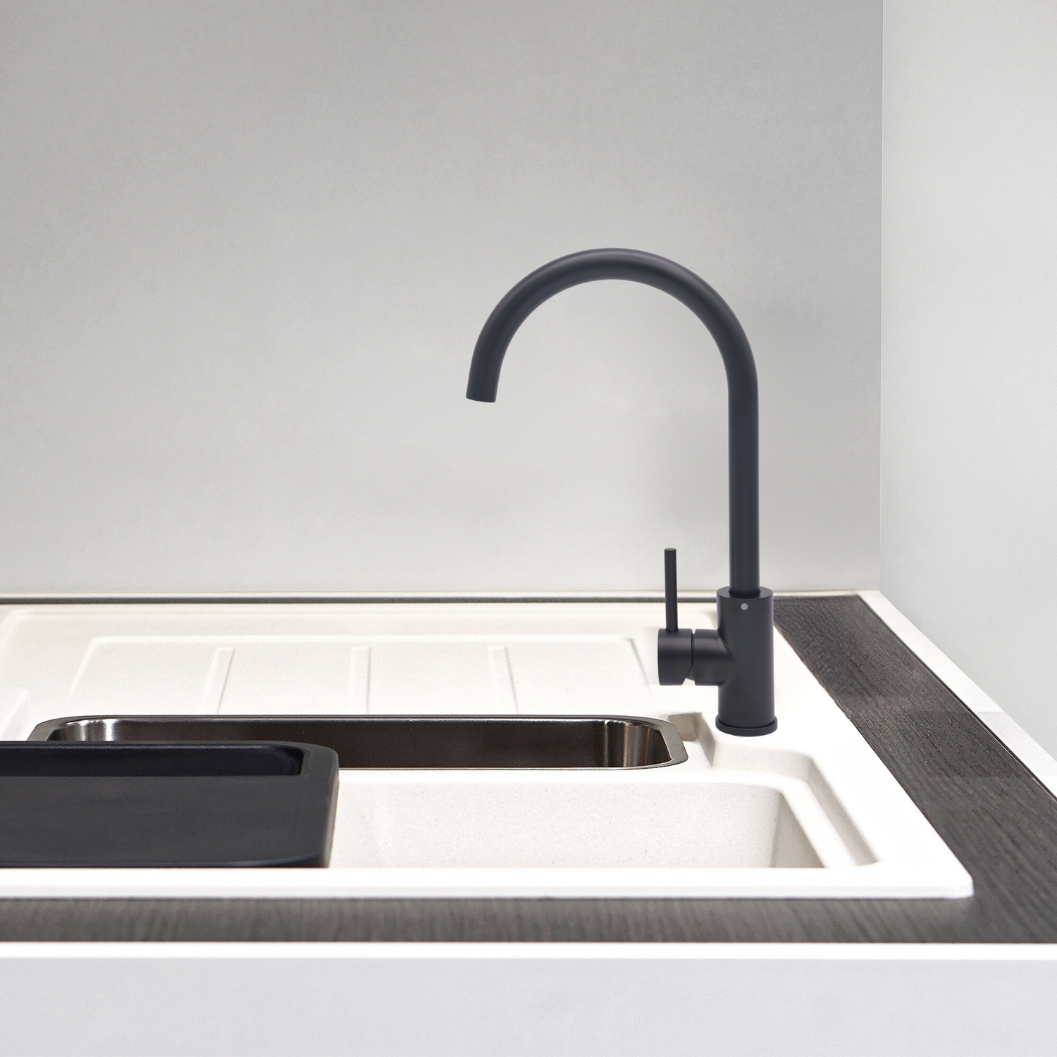 This elegant mixer features a sleek, matte black finish that adds a touch of sophistication to any kitchen decor. The high-arching gooseneck design provides ample clearance for filling large pots and pans, while the 360-degree swivel spout ensures maximum flexibility and ease of use